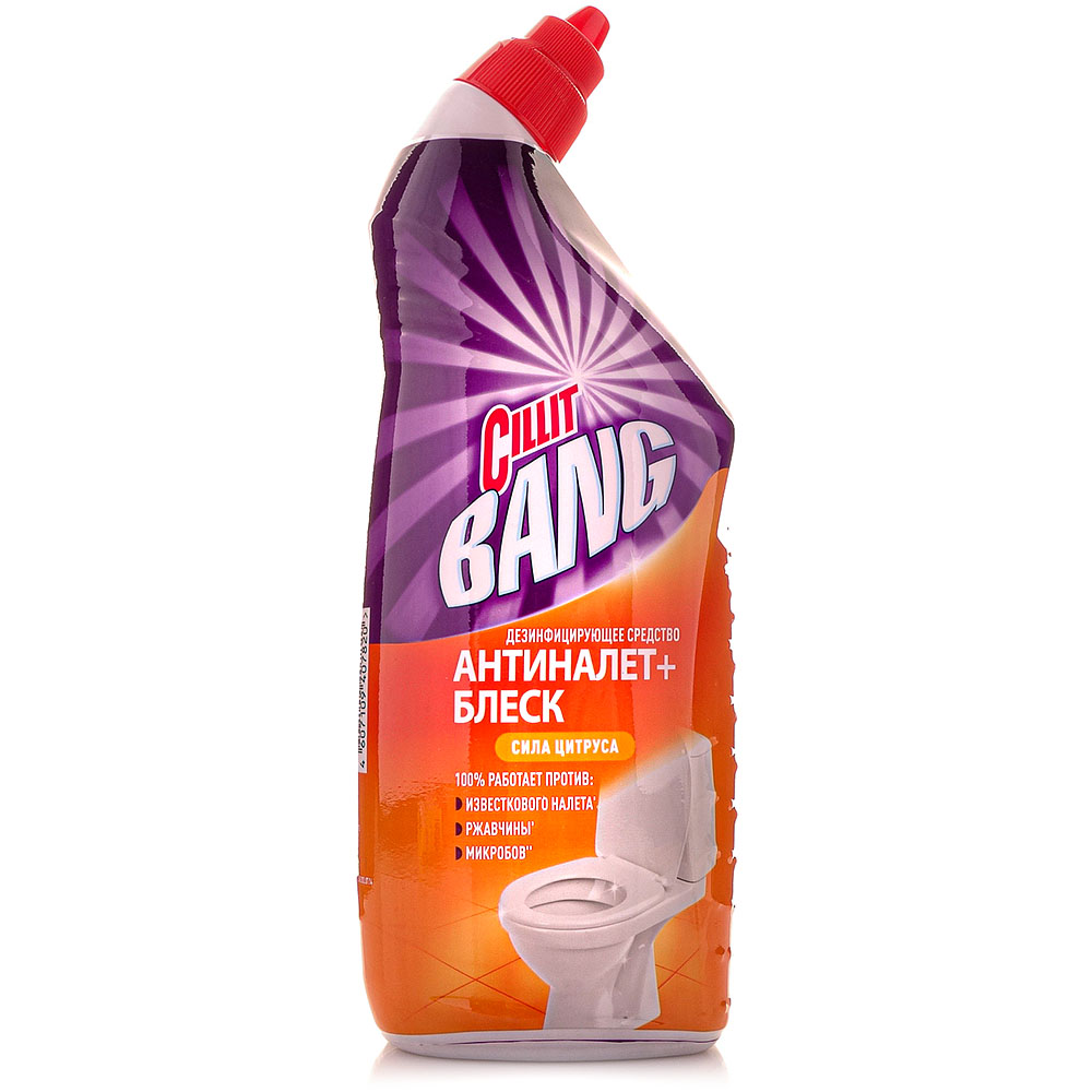 Средство для уборки туалета CILLIT BANG удаляет 100% известкового налета и ржавчины, эффективно очищает поверхность от загрязнений и придает аромат свежести и чистоты.