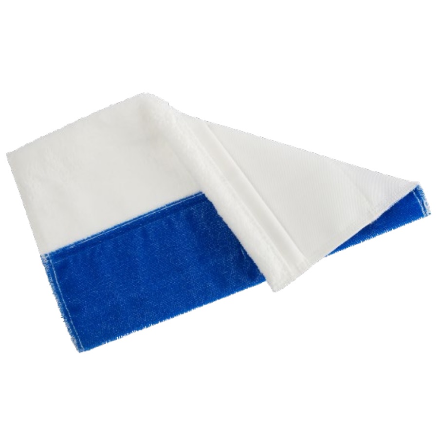 Абразивы средней жесткости на синей стороне мопа активируют загрязнения, а белое микроволокно их собирает, удерживает и моет поверхность.