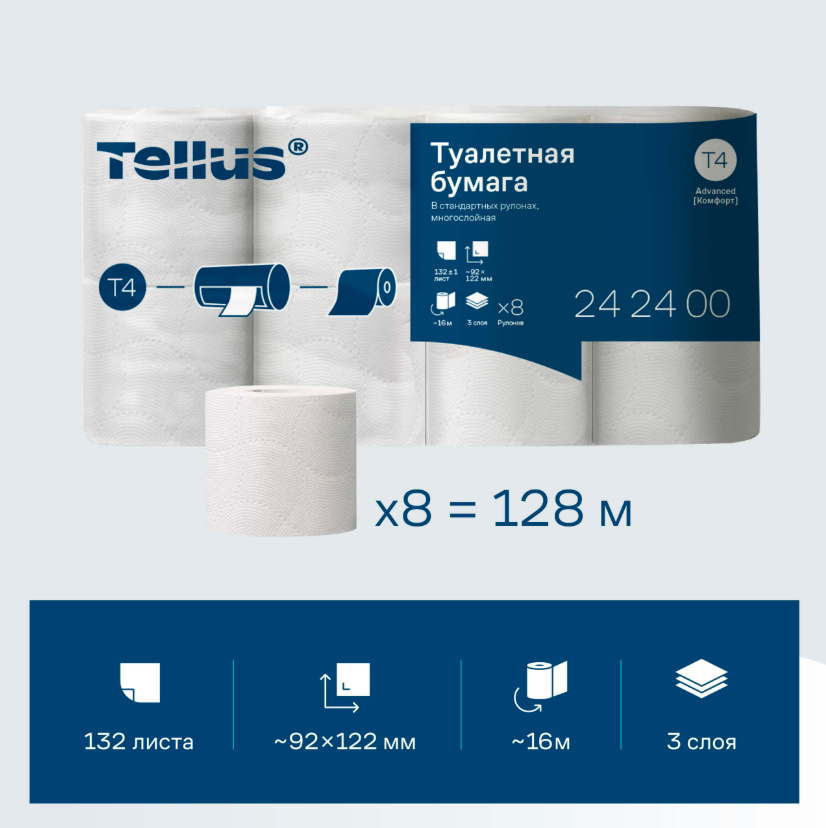 242400 Tellus Advanced туалетная бумага в стандартных рулонах, 3-слойная, белая,16 м, 8 шт. в упаковке, Т4/7