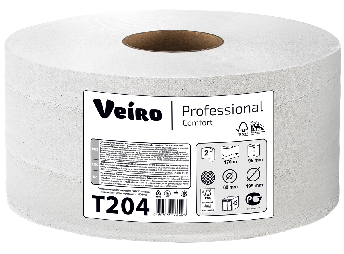 Туалетная бумага Veiro Comfort Т204, 170 метров, 2-х слойная, белая /12