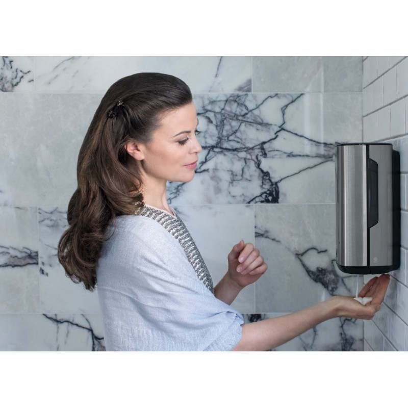 Автоматический дозатор мыла-пены. Имеет слегка матовую металлическую поверхность, на которой не остается отпечатков пальцев.