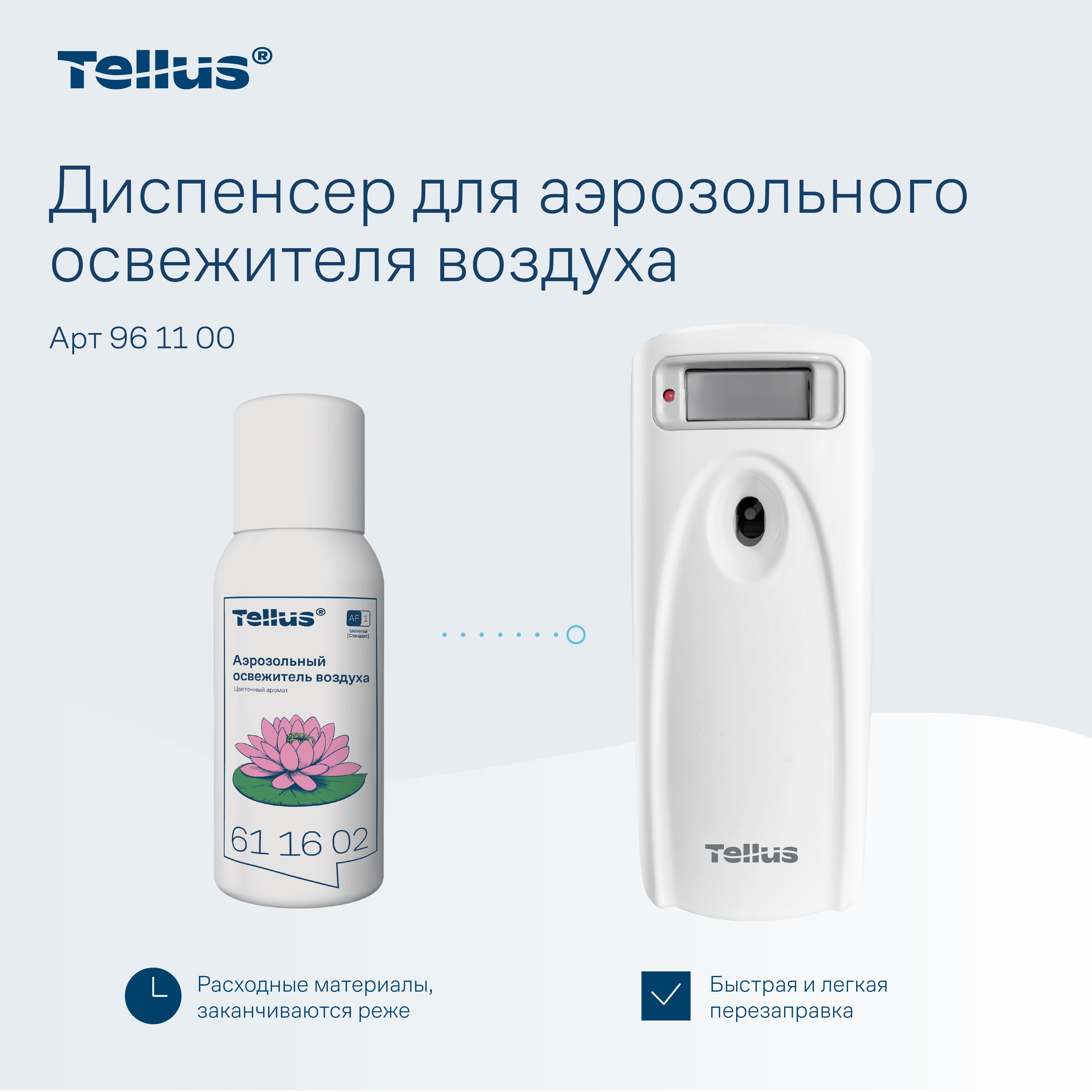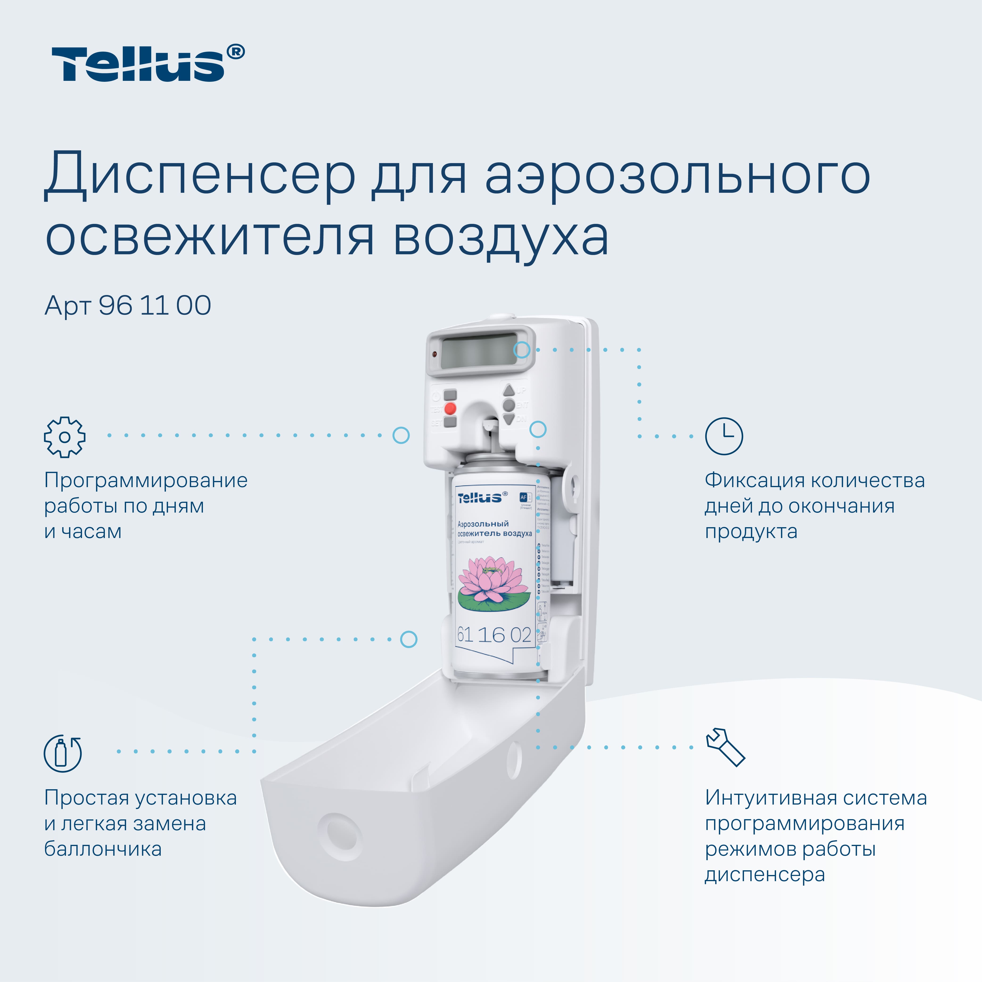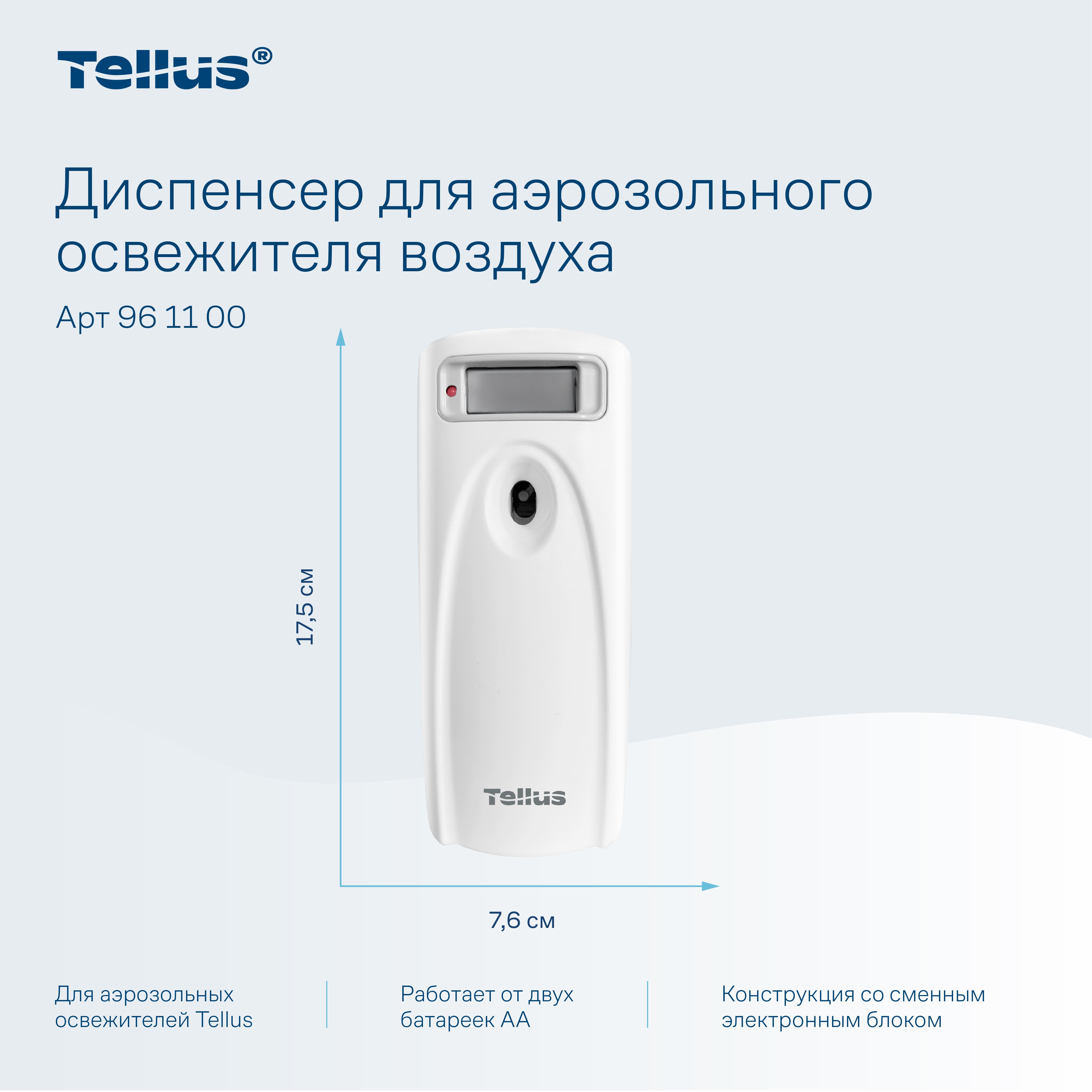 Диспенсер для аэрозольного освежителя воздуха Tellus — это современное решение для поддержания свежести и комфорта в любых помещениях. Благодаря своим функциональным возможностям и стильному дизайну, он идеально подходит для туалетных комнат с любым уровнем проходимости, будь то офисные здания, гостиницы, рестораны или торговые центры.