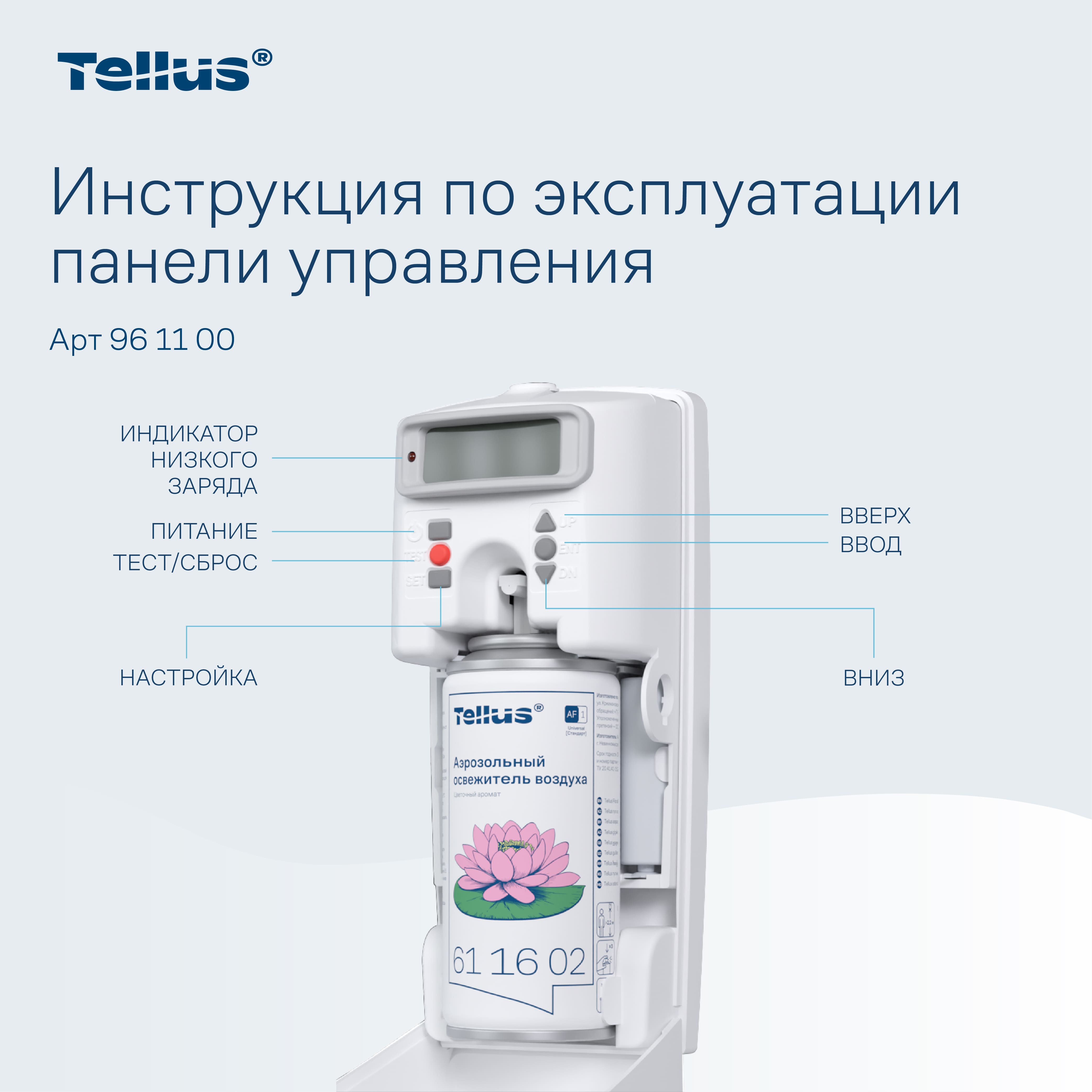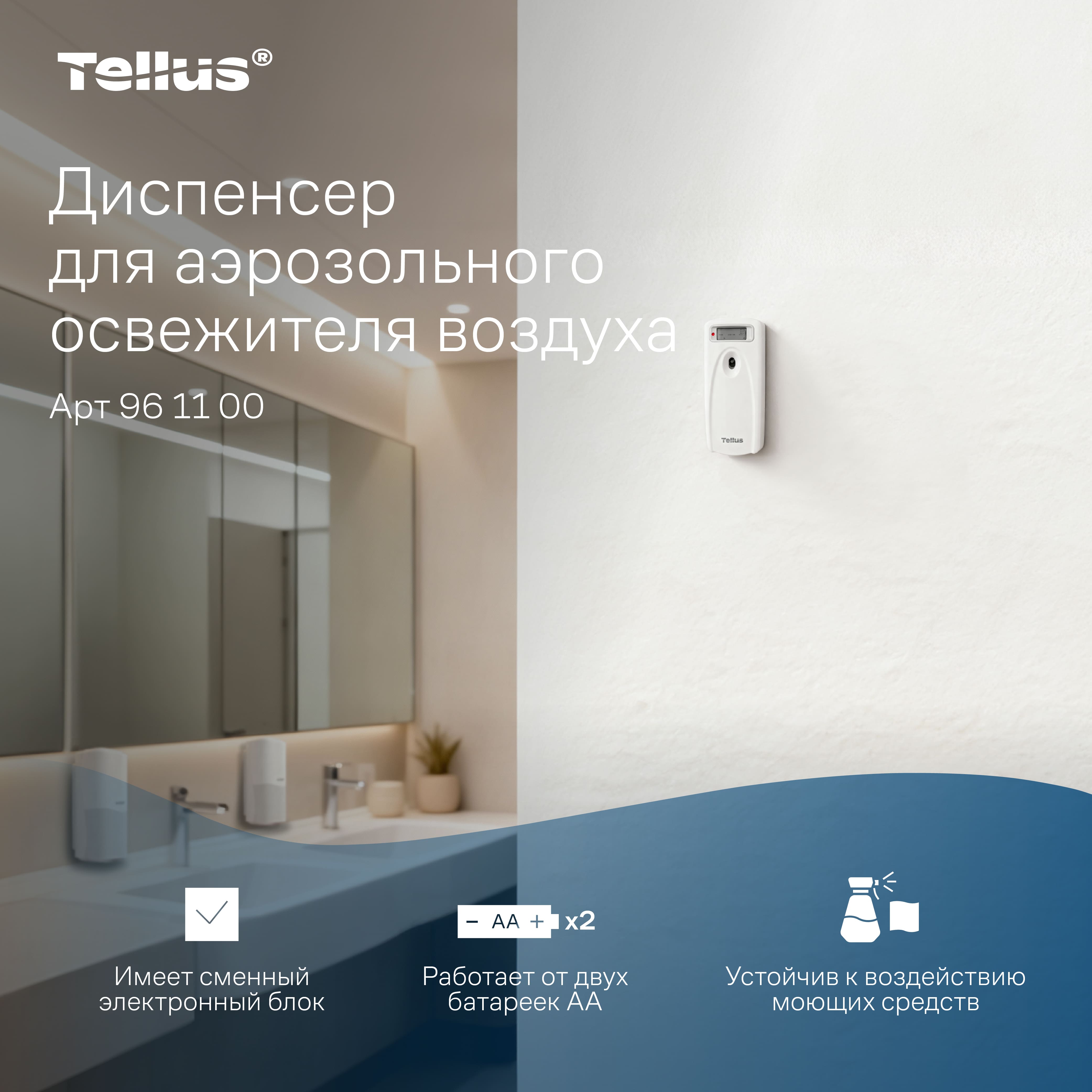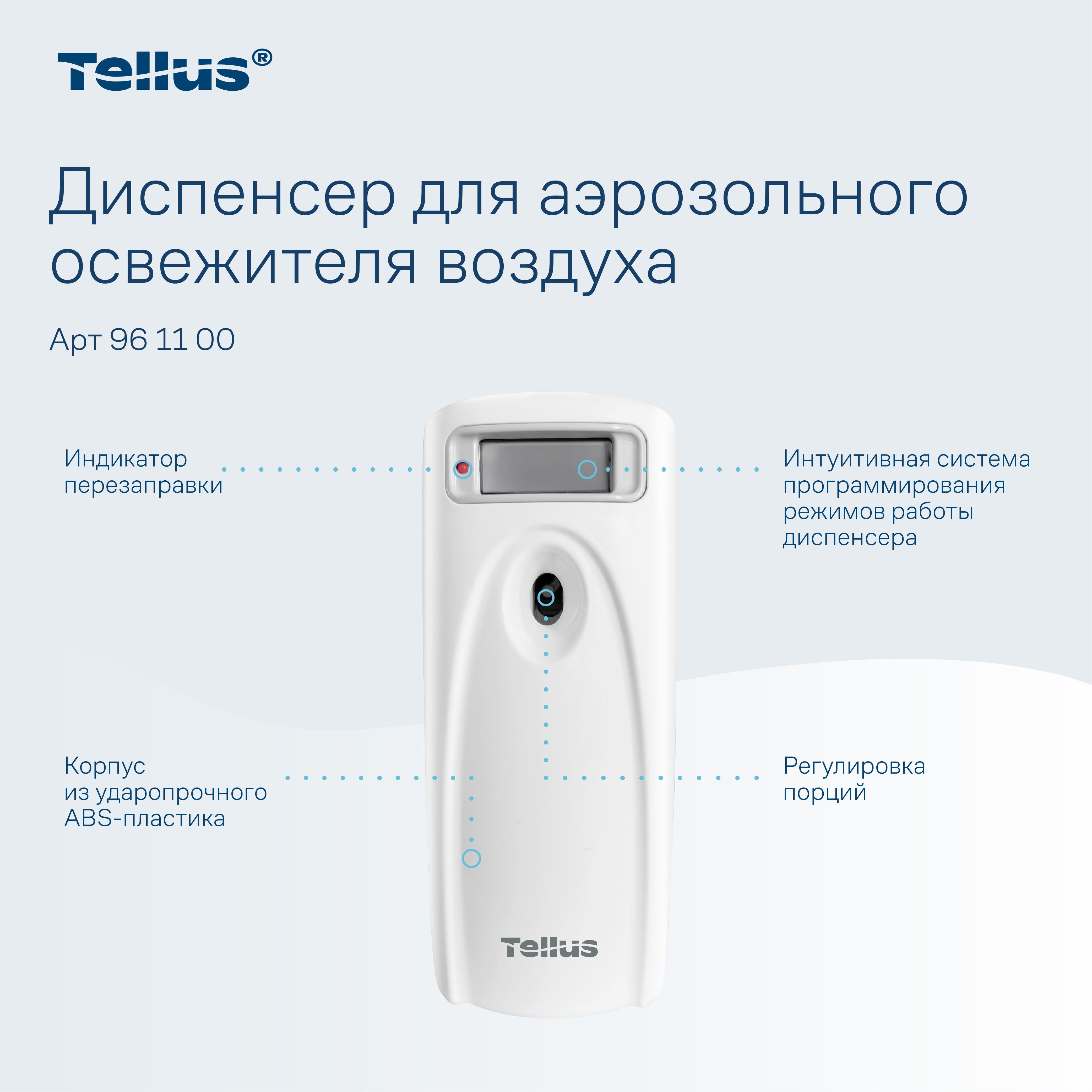 Диспенсер для аэрозольного освежителя воздуха Tellus — это современное решение для поддержания свежести и комфорта в любых помещениях. Благодаря своим функциональным возможностям и стильному дизайну, он идеально подходит для туалетных комнат с любым уровнем проходимости, будь то офисные здания, гостиницы, рестораны или торговые центры.